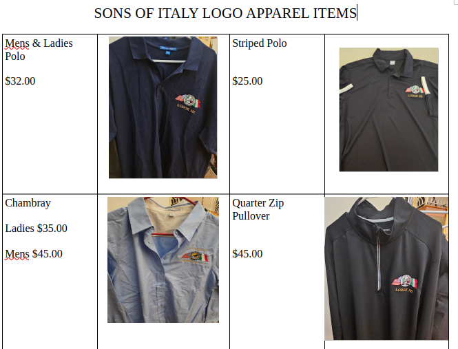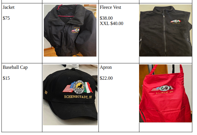 We have a new line of apparel for purchase. Tina is taking orders for apparel with the Lodge logo. Apparel items include baseball caps, aprons, polo shirts for men and women, sweatershirts, long sleeve dress shirts, and jackets.